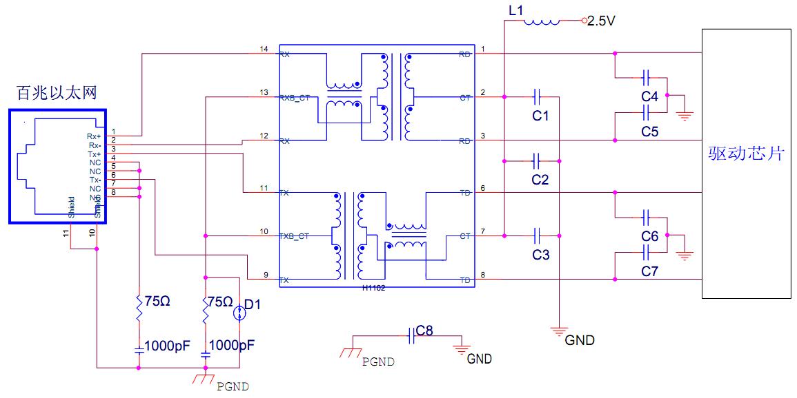 百兆以太網(wǎng)接口2KV防雷濾波設(shè)計